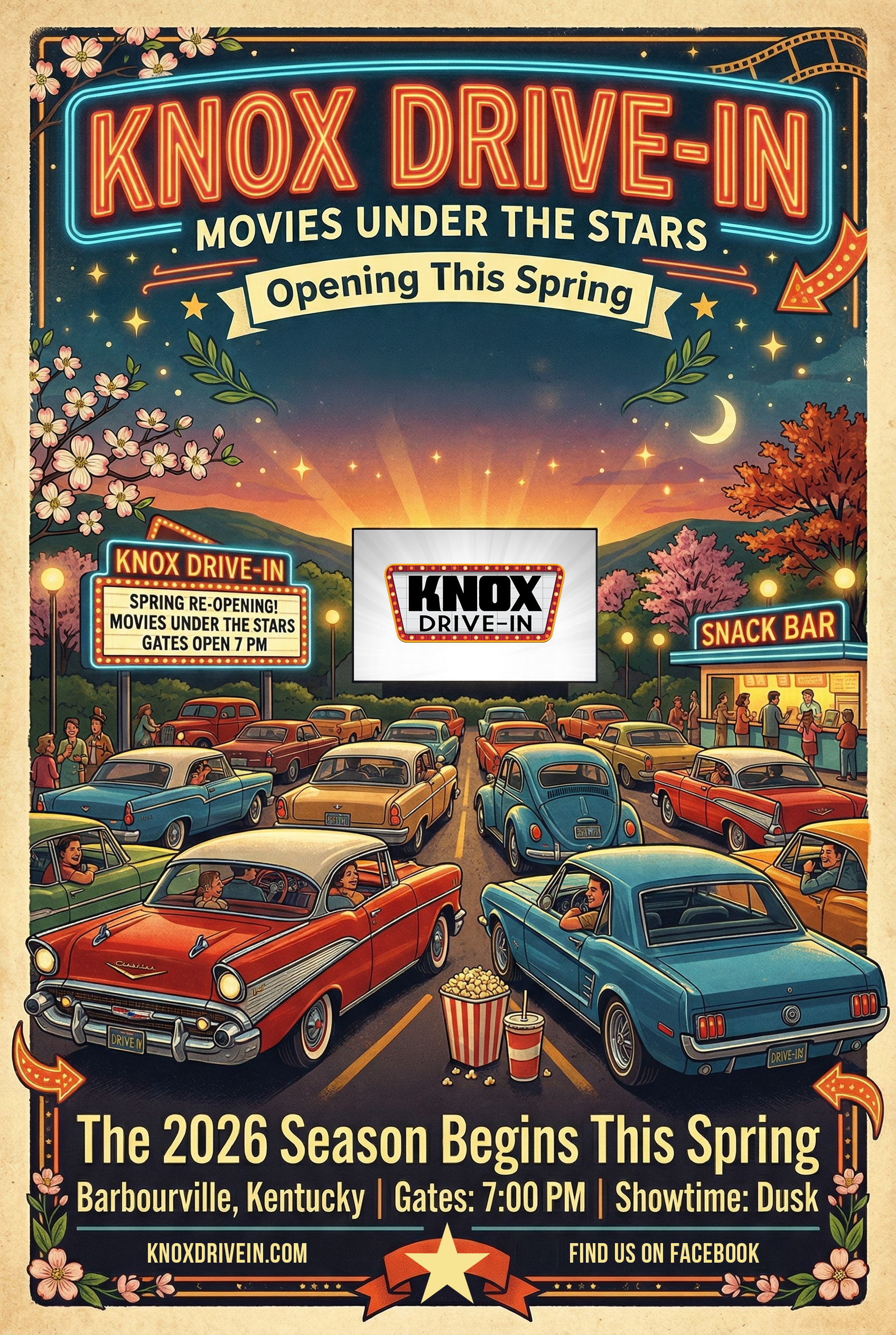 Nestled in the heart of the city of Barbourville in Knox County, Knox Drive-In offers a unique movie-going experience. Whether you’re enjoying a family outing or a peaceful night surrounded by nature, we’re here to provide a memorable evening with great movies, stunning sunsets, and the opportunity to relax and enjoy the night air.